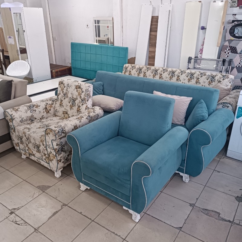 İki adet üçlü kanepe ve iki berjerden oluşan bu şık ikinci el koltuk takımı, mavi ve çiçek desenli kumaş kombinasyonu ile salonunuza zarif ve konforlu bir hava katar.
