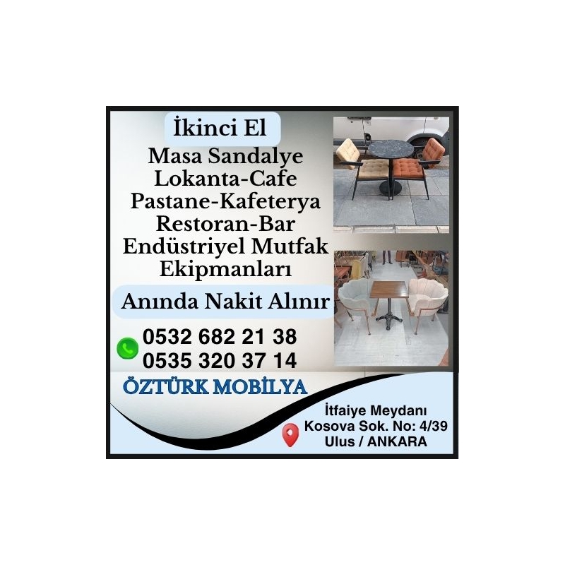 Ankara Altındağ’da hizmet veren Öztürk Mobilya; lokanta, cafe, restoran, pastane, kahvehane ve eğlence mekânlarına özel sıfır ve ikinci el masa sandalye takımları ile endüstriyel mutfak ekipmanları alım satımı yapmaktadır.