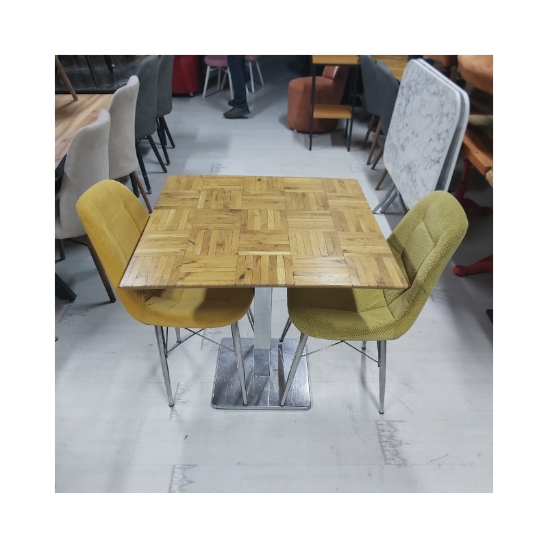 Modern çizgileriyle dikkat çeken, ahşap desenli kare masa ve konforlu kumaş sandalyelerden oluşan 11 takım masa sandalye seti. Kafe, restoran ve lokantalar için idealdir.