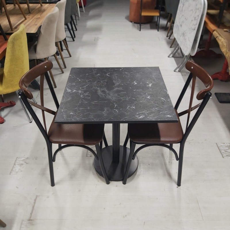 Siyah mermer desenli kare masa ve kahverengi sandalyelerden oluşan 10 masa 20 sandalye takımı. Kafe, restoran ve lokantalar için idealdir. Şık ve dayanıklı yapısıyla dikkat çeker.