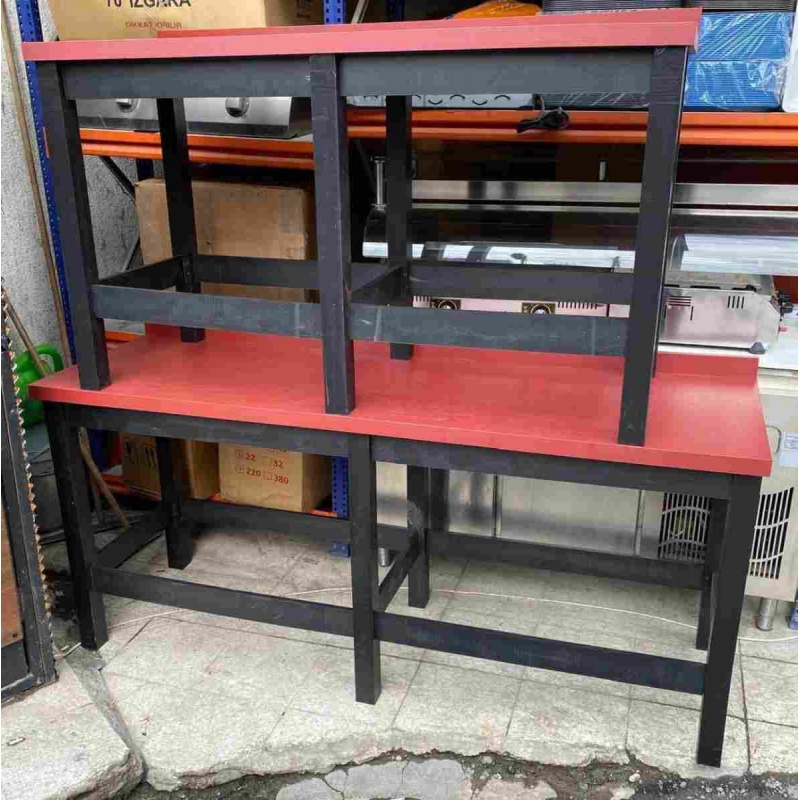 Mutfak ve imalathanelerde kullanım için tasarlanmış, dayanıklı siyah metal iskelete ve temiz kırmızı tablaya sahip çalışma masaları. Hem hazırlık tezgahı hem de servis masası olarak kullanıma uygundur. Sağlam yapısı ile uzun ömürlüdür.